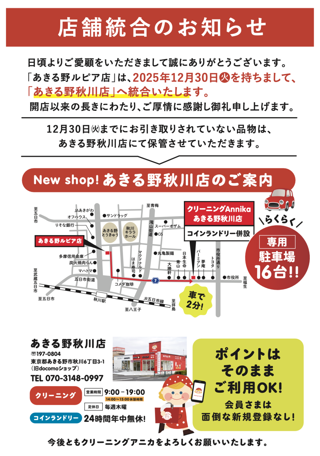 「あきる野ルピア店」は、2025年12月30日(火)を持ちまして、「あきる野秋川店」へ統合いたします。